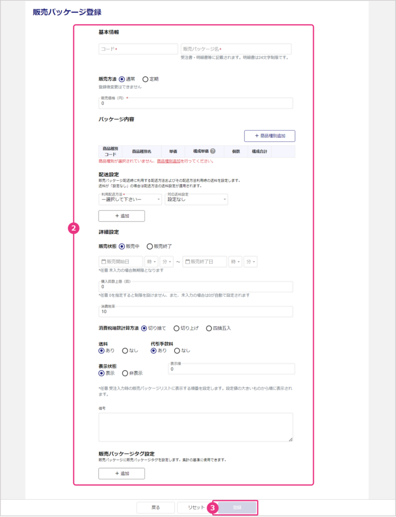 販売パッケージを登録します。あらかじめ商品種別の登録を済ませておく必要があります。