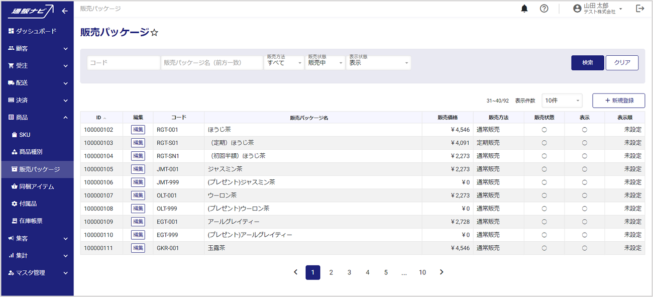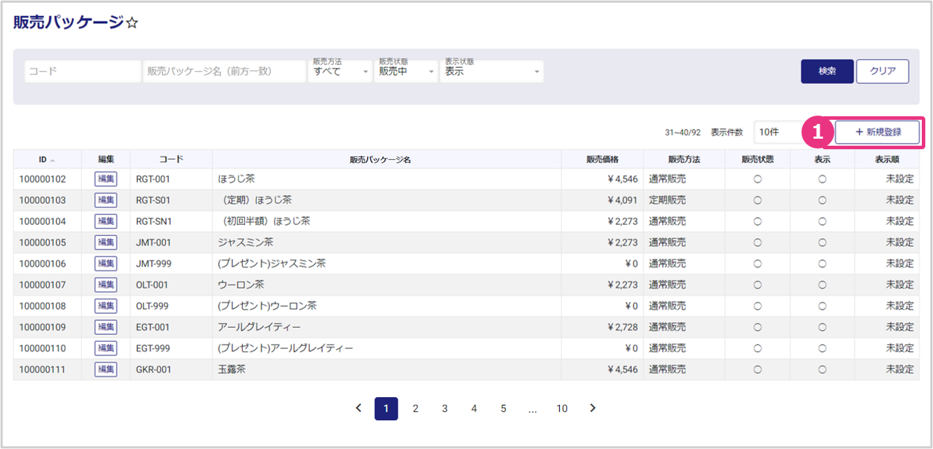 左メニューから、商品>販売パッケージを開くと、販売パッケージ検索画面が表示されます。