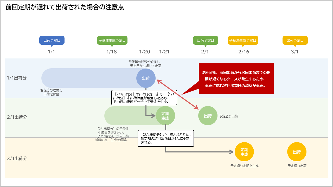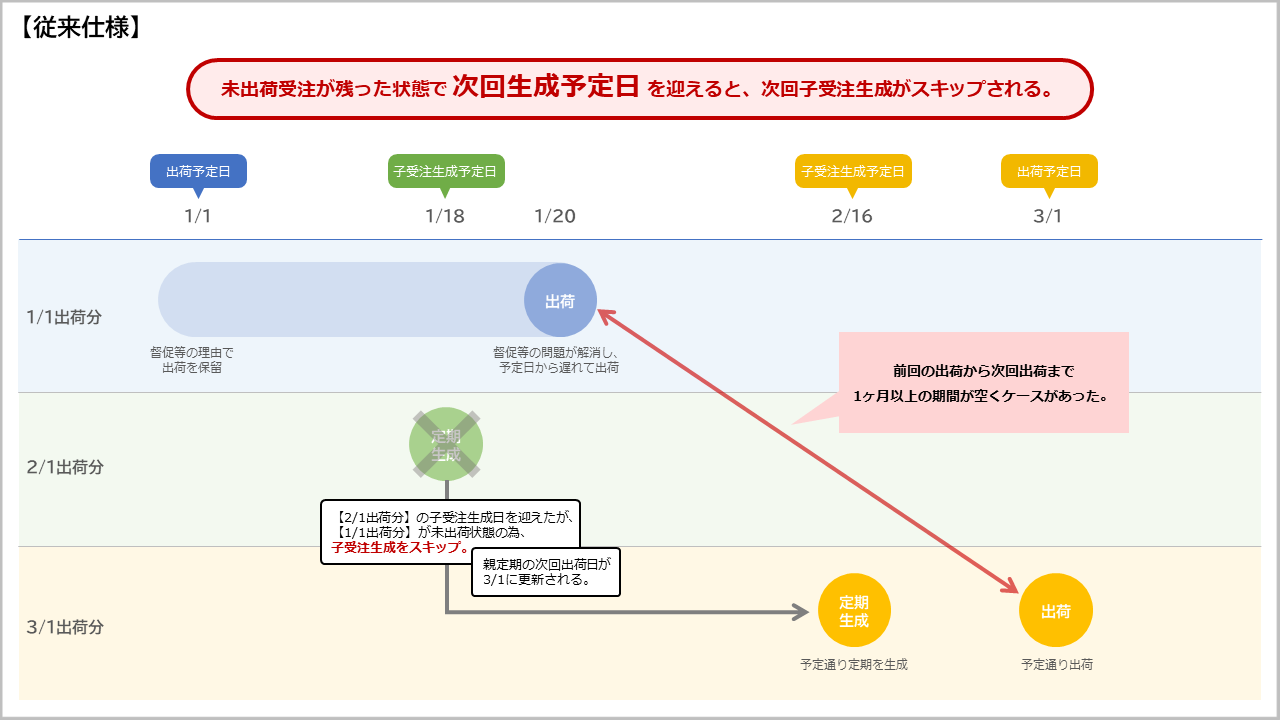 未出荷受注が残っている状態で次回生成予定日を迎えると、次回子受注生成をスキップする。