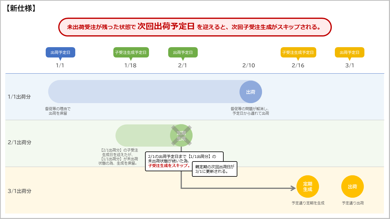 未出荷受注が残っている状態で次回出荷予定日を迎えると、次回子受注生成をスキップする。