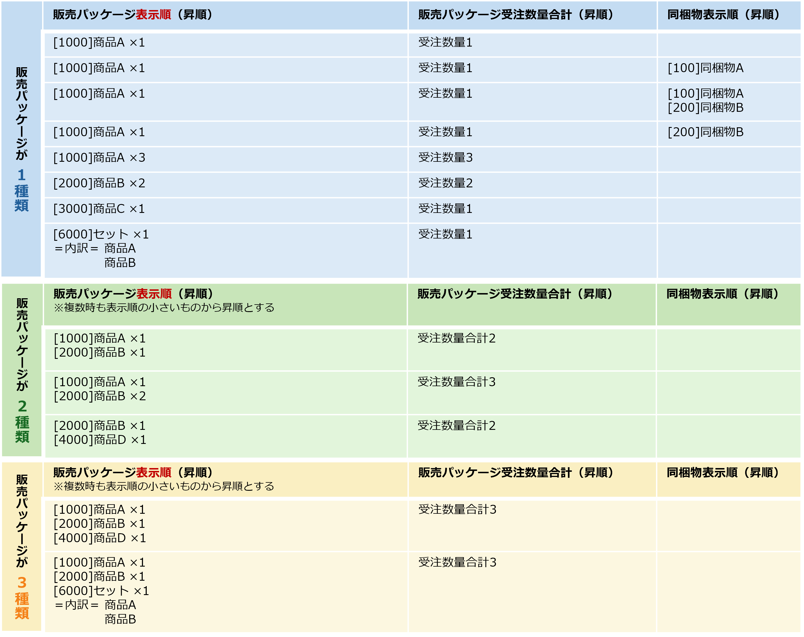 「販売パッケージ表示順」を指定すると、販売パッケージの種類数をベースに、販売パッケージ表示順昇順で並び替え出力されます。