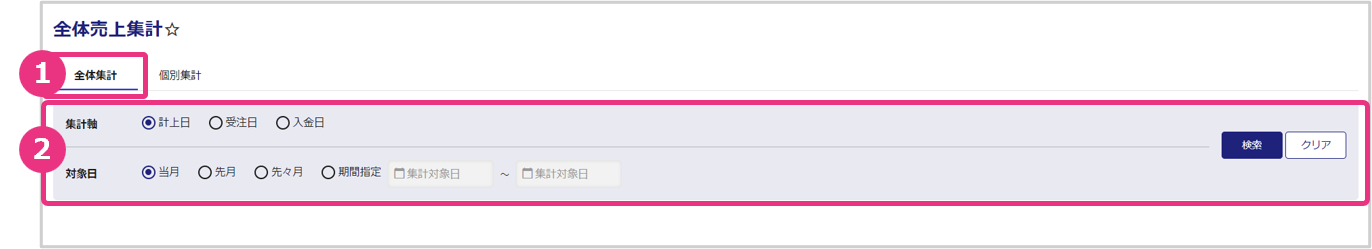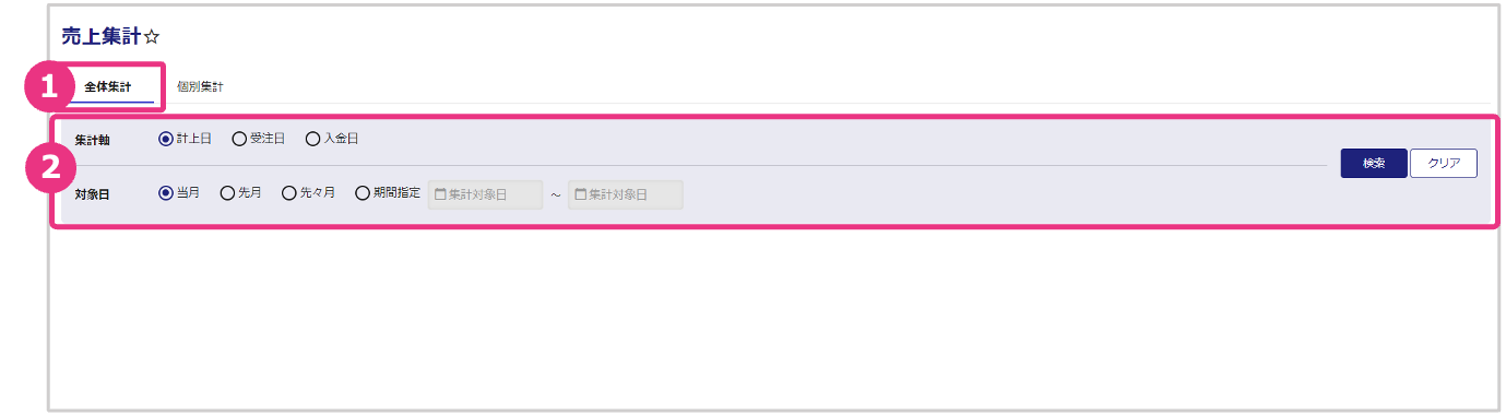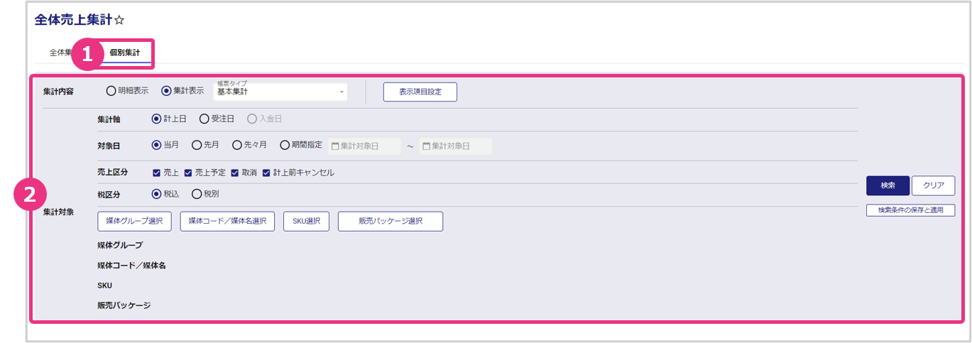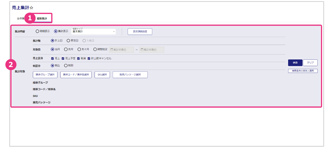 | 集計表示内容 | 集計結果の表示内容を選択します。(明細表示/集計表示) |