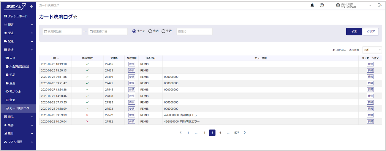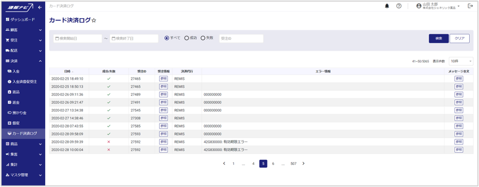 カード決済ログの検索や、決済処理失敗理由の確認が可能です。