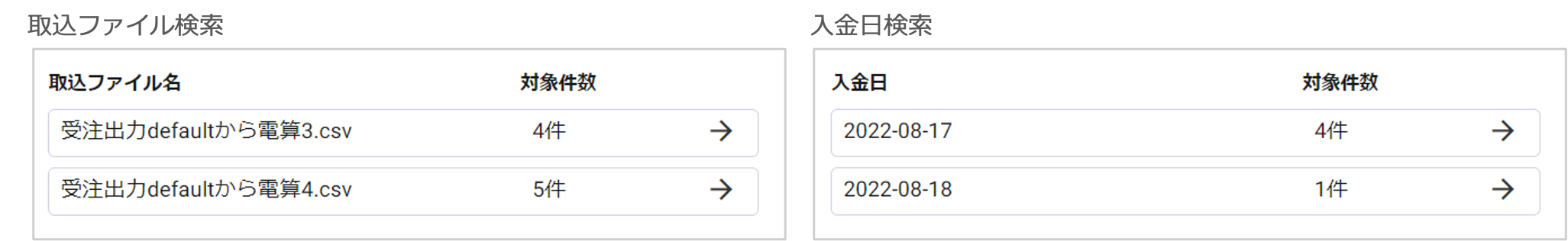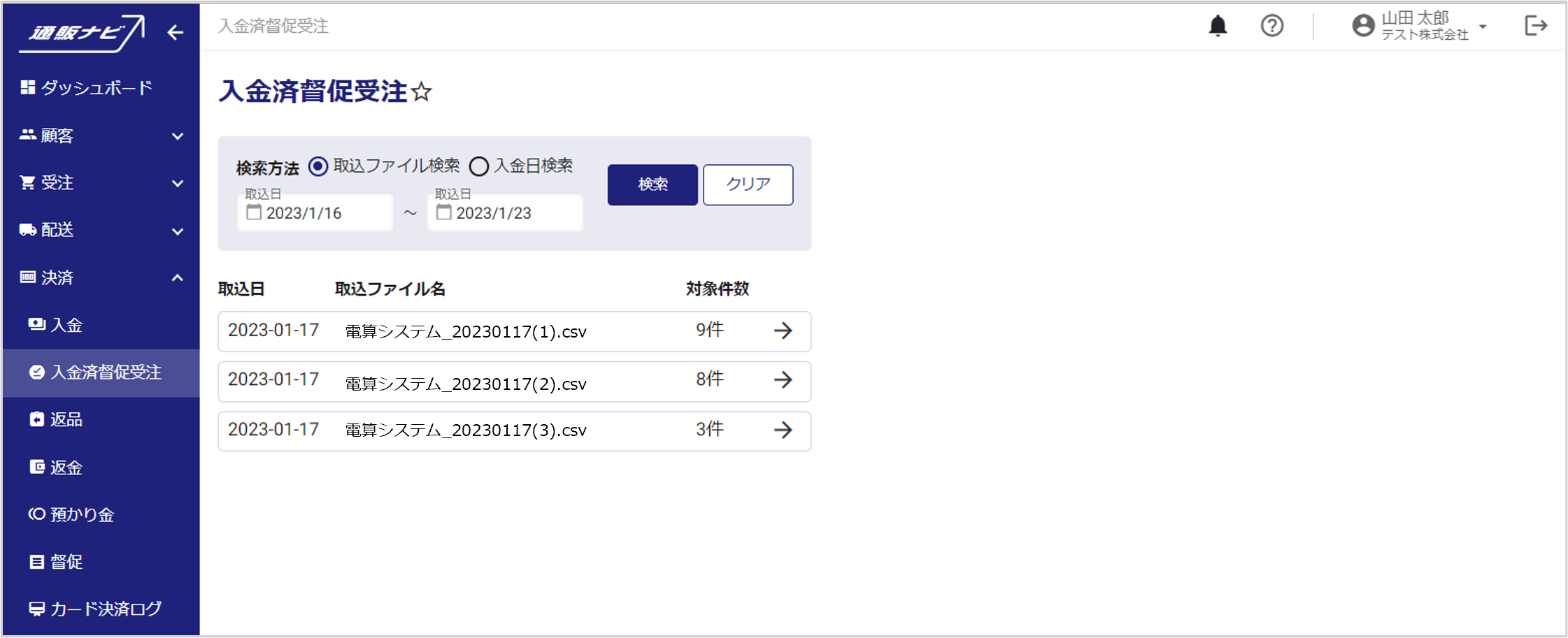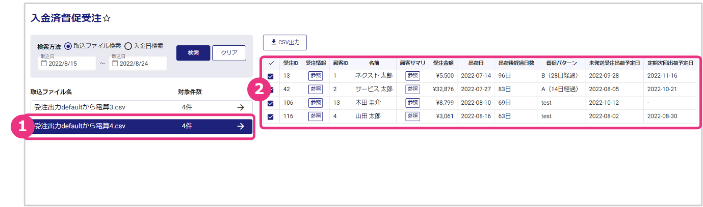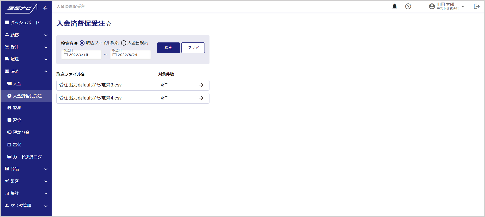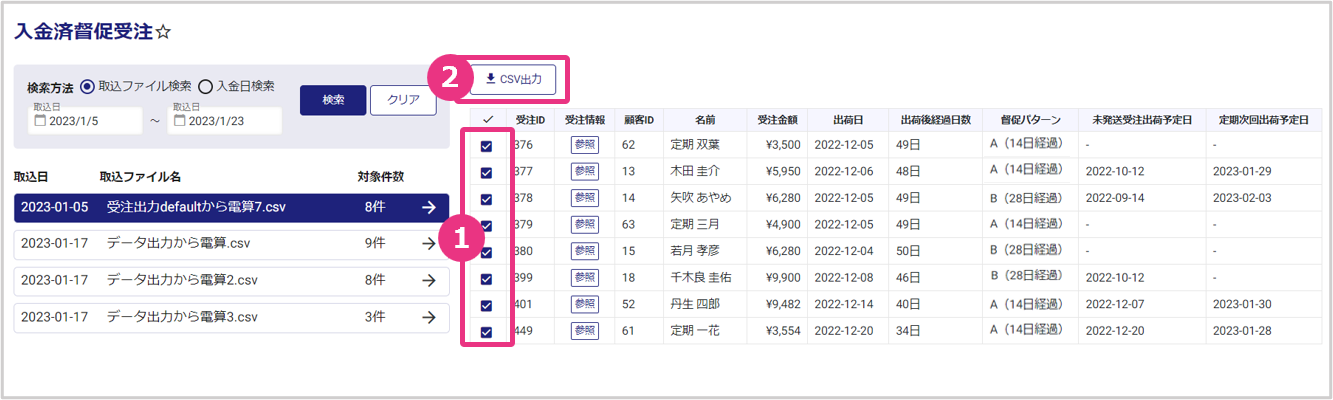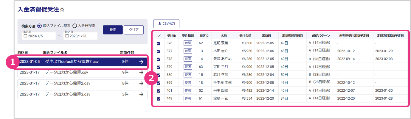 決済 入金済督促受注 督促状態から入金完了となった受注の検索が可能です。督促により出荷が止まっていた受注および定期の次回出荷予定日を確認し、必要に応じて出荷日の調整を行います。 目次 [閉じる]1 入金済督促受注リスト検索画面2 入金済督促受注情報を確認する3 入金済督促受注リストをCSV出力する 入金済督促受注リスト検索画面 左メニューから、決済>入金済督促受注を開くと、督促状態から入金完了となった受注の検索画面が表示されます。 項目説明(詳細はクリックして下さい。) 検索条件 検索方法取込ファイルの取込日で検索する場合は「取込ファイル検索」を選択し、入金日で検索する場合は「入金日検索」を選択します。取込日/入金日検索方法で「取込ファイル検索」を選択の場合は。取込日FROM・TOを入力します。検索方法で「入金日検索」を選択の場合は、入金日FROM・TOを入力します。 検索結果 取込ファイル名/入金日検索方法で「取込ファイル検索」を選択した場合は、取込ファイル名を表示します。検索方法で「入金日検索」を選択した場合は、入金日を表示します。対象件数対象の取込ファイルまたは入金日に、何件の督促入金完了が含まれていたかを表示します。 入金済督促受注情報を確認する 入金済みの済督促受注の詳細確認が可能です。 詳細情報を参照したい検索結果をクリックします。 選択した取込ファイルまたは入金日の入金済督促受注情報が表示されます。 項目説明(詳細はクリックして下さい。) 受注ID受注IDを表示します。受注情報『参照』をクリックすると、受注情報詳細画面が開きます。顧客ID顧客IDを表示します。顧客サマリ『参照』をクリックすると、顧客サマリが開きます。受注金額受注金額を表示します。出荷日出荷日を表示します。出荷後経過日数出荷後の経過日数を表示します。督促パターン督促パターンを表示します。未発送受注出荷予定日督促で出荷が止まっていた受注の出荷予定日を表示します。定期次回出荷予定日次回の定期商品出荷予定日を表示します。 入金済督促受注リストをCSV出力する 入金済督促受注リストのCSV出力が可能です。 CSV出力したい入金済督促受注リストのみ、✓欄のチェックが入った状態にします。(「✓」マークをクリックすると全件一括チェック解除・一括チェックが可能です。) 『CSV出力』をクリックすると、チェックした入金済督促受注リストがCSVファイルでダウンロードされます。