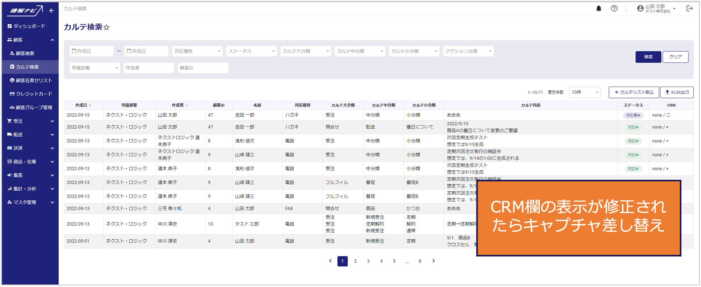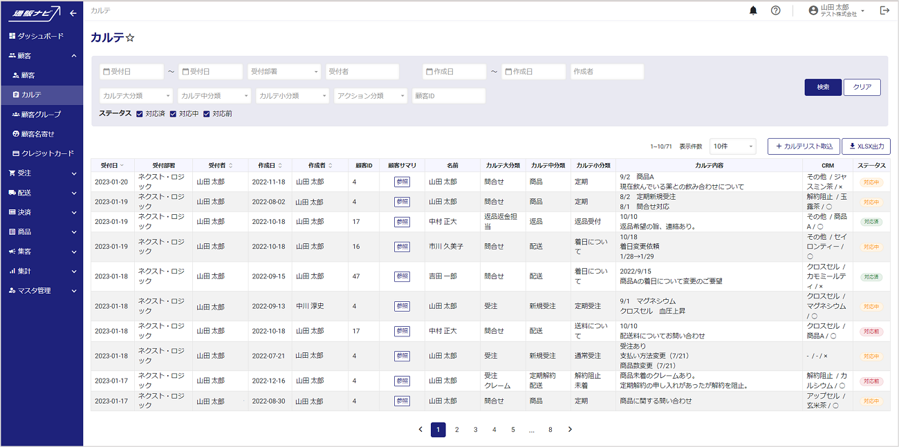左メニューから、顧客>カルテを開くと、カルテ検索画面が表示されます。