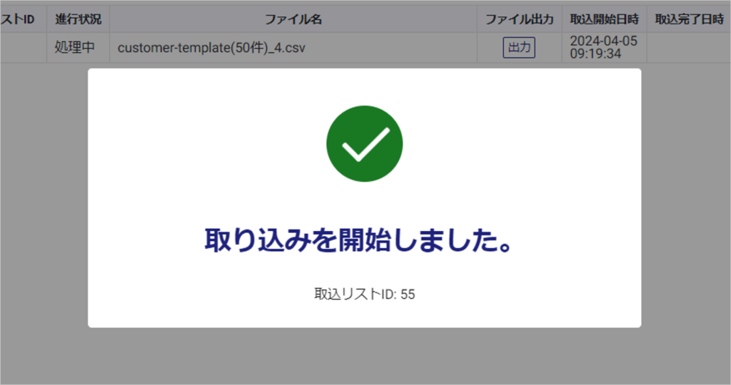 進行状況が「処理中」の場合は画面右側の『更新』ボタンをクリックし、最新の進行状況を確認してください。