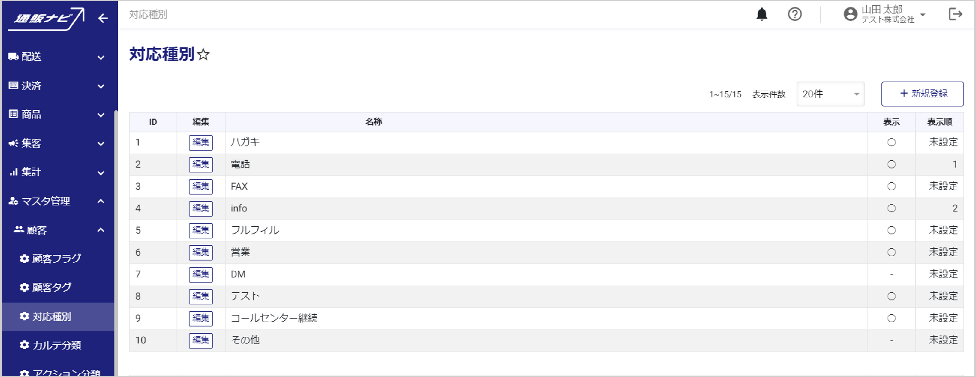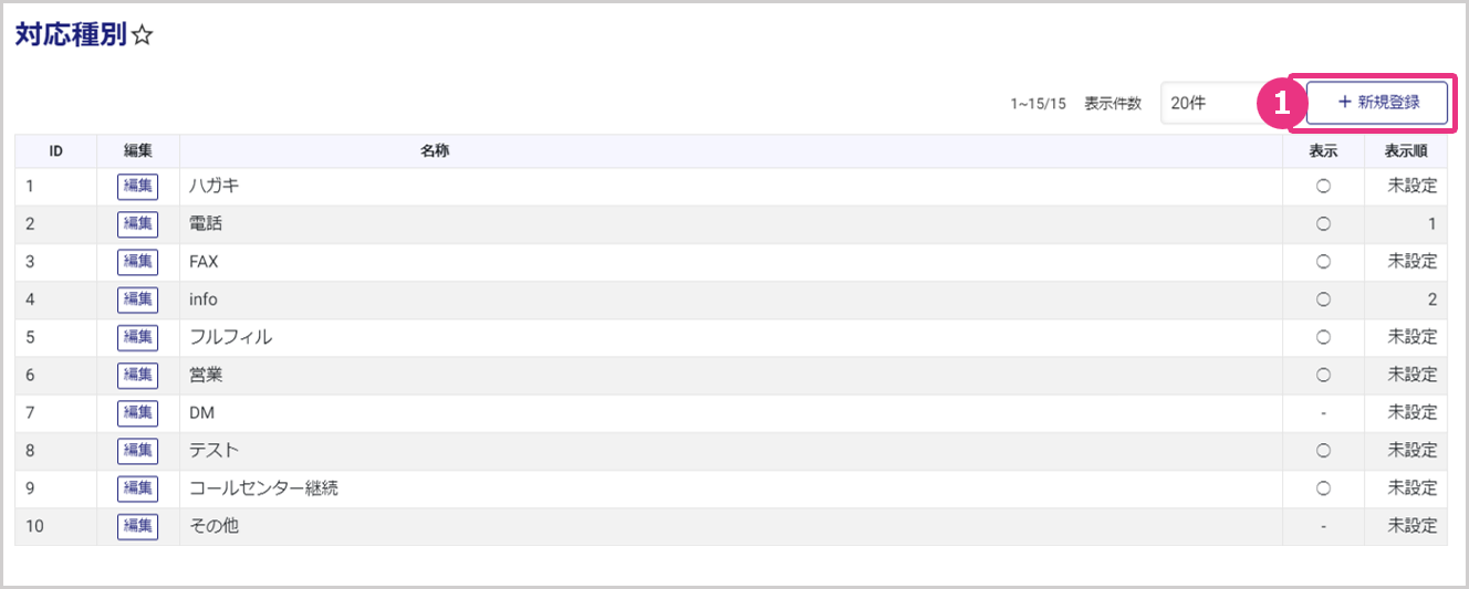 左メニューから、マスタ管理>顧客>対応種別を開くと、対応種別一覧が表示されます。