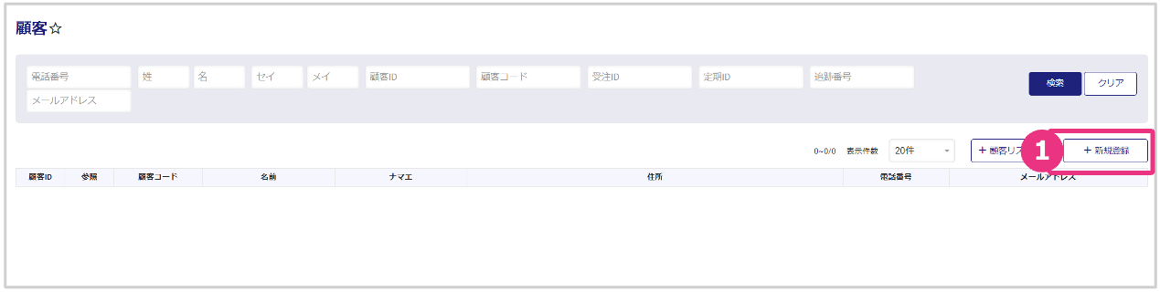 新規登録時は、顧客情報の重複を防ぐため、顧客検索で同一顧客が存在しないことを確認してください。すでに登録済みの顧客を新規で登録してしまった場合は【顧客名寄せ】から顧客データの統合が可能です。