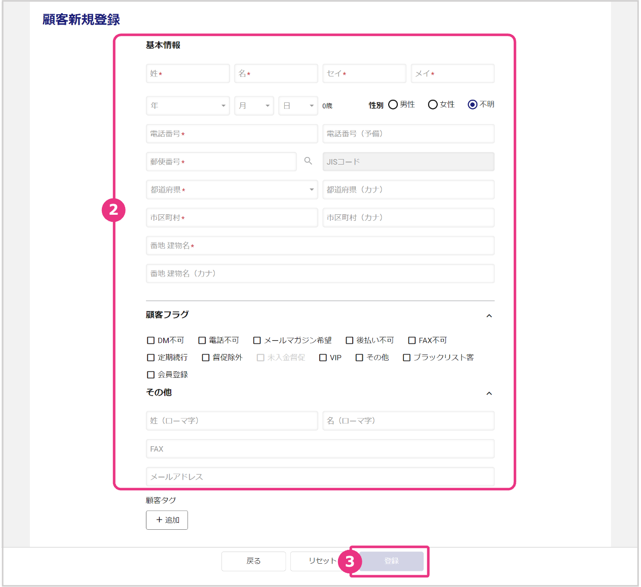 | 顧客タグ | 『追加』をクリックし、キーと値を選択します。顧客タグは複数登録することが可能です。 ※選択できる顧客タグはマスタ管理>顧客>顧客タグの設定により異なります。 ※選択した内容はオペレータの閲覧用であり、機能に影響するものではありません。 |