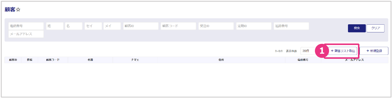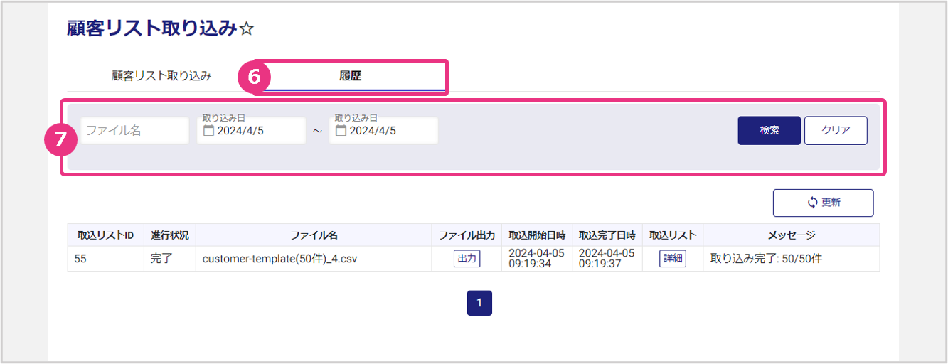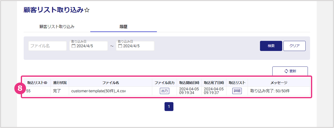 | 取込リスト | 『詳細』を押下すると取り込まれた顧客一覧が参照できます。 |