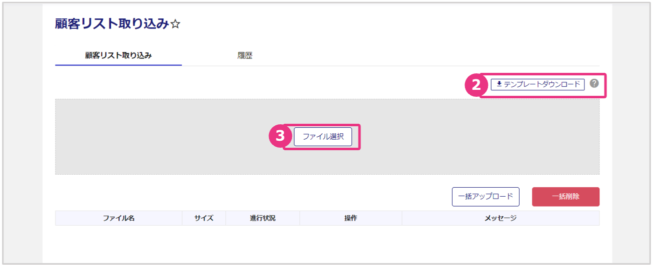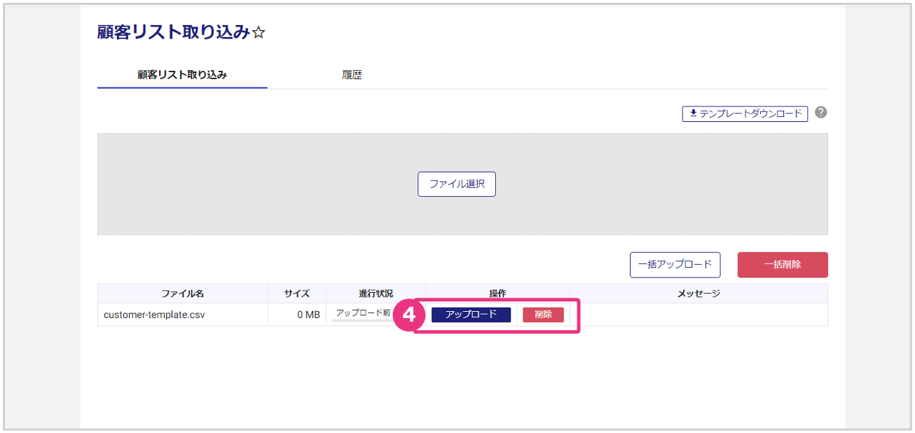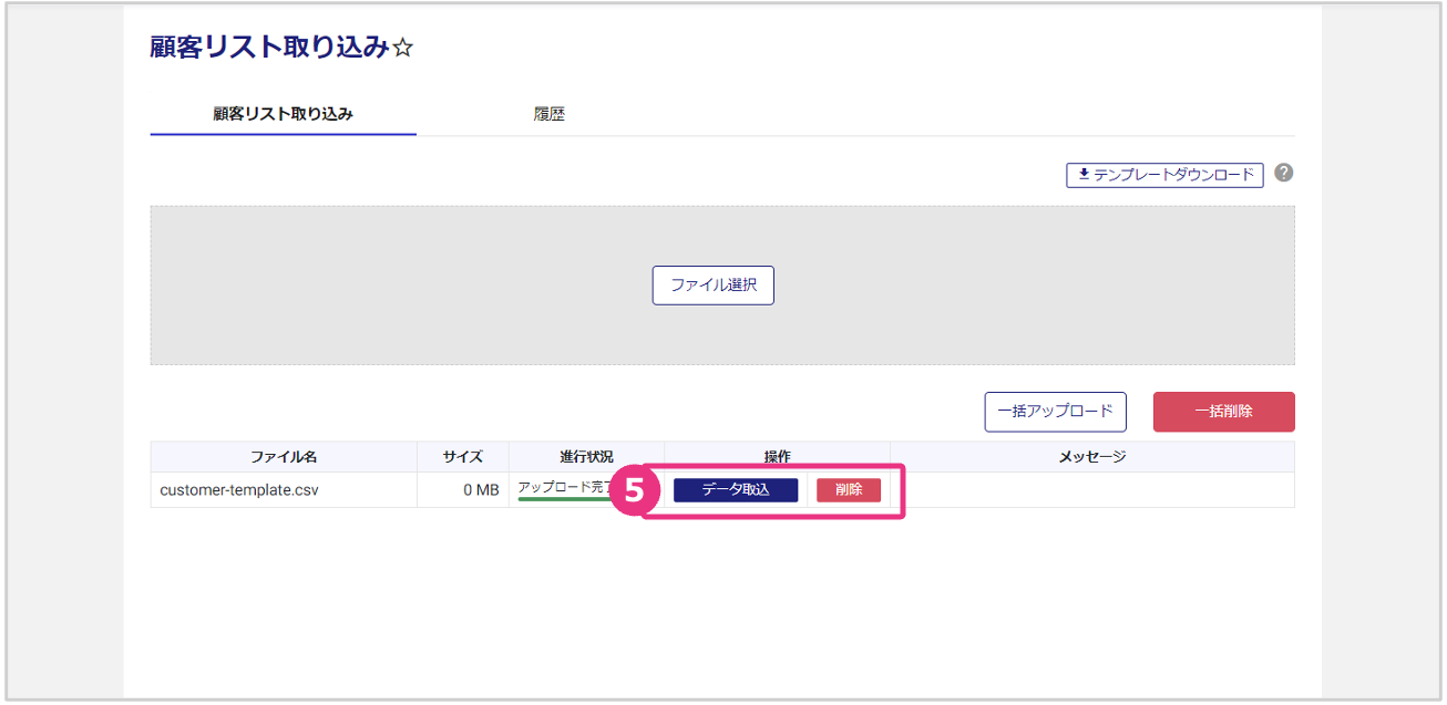 ※アップロードが完了しても顧客情報は登録されません。必ず⑤のデータ取込まで行ってください。