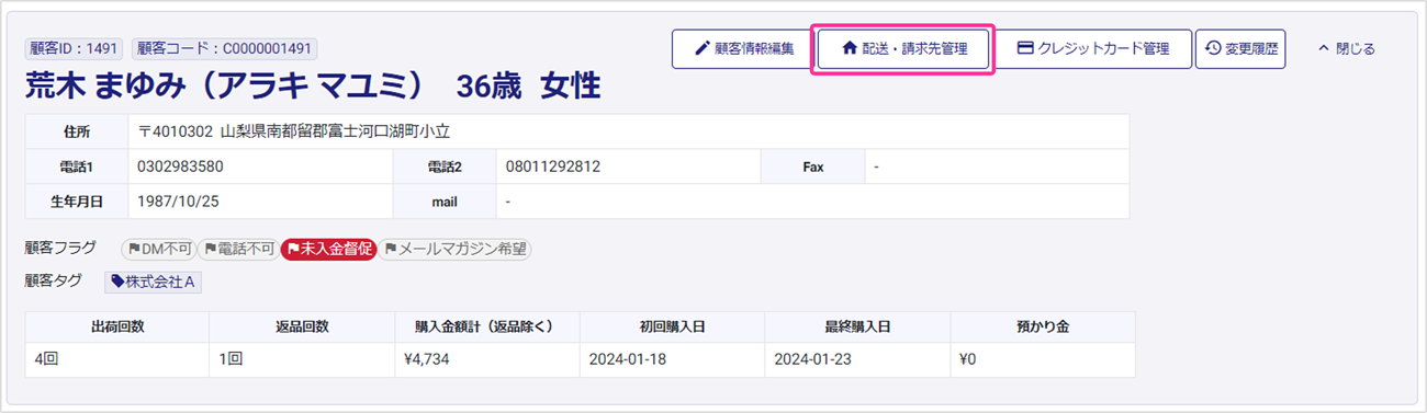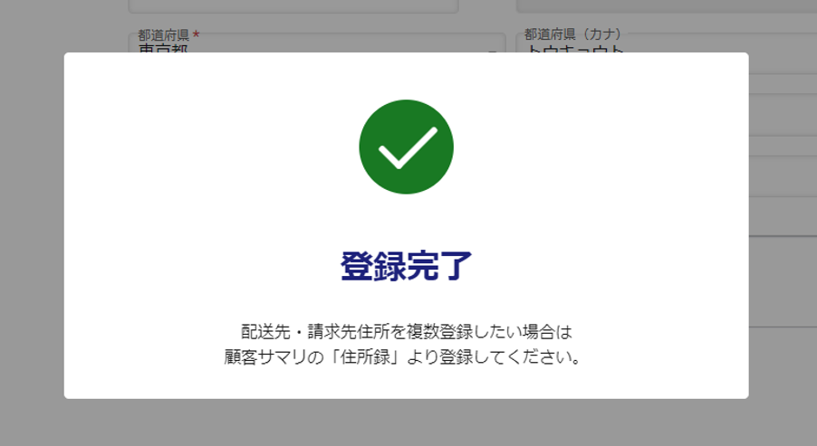 受注登録時の配送先・請求先住所が顧客住所と異なる場合、顧客登録後に作成される顧客サマリの「配送・請求先管理」から住所を登録しておくことで、受注登録時に簡単に変更することができます。