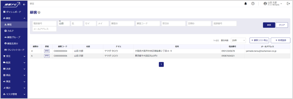 左メニューから、顧客>顧客を開くと、顧客検索画面が表示されます。
