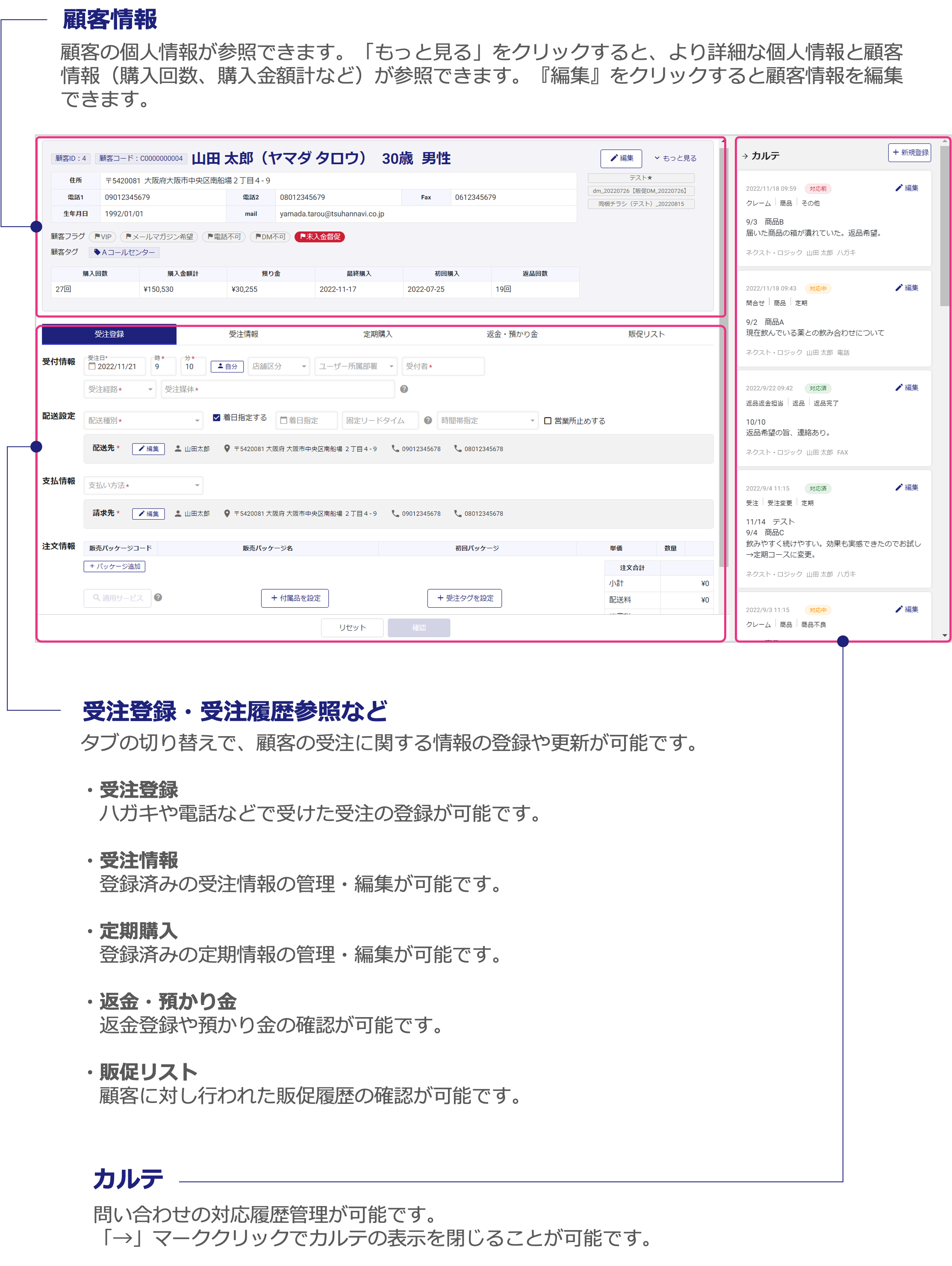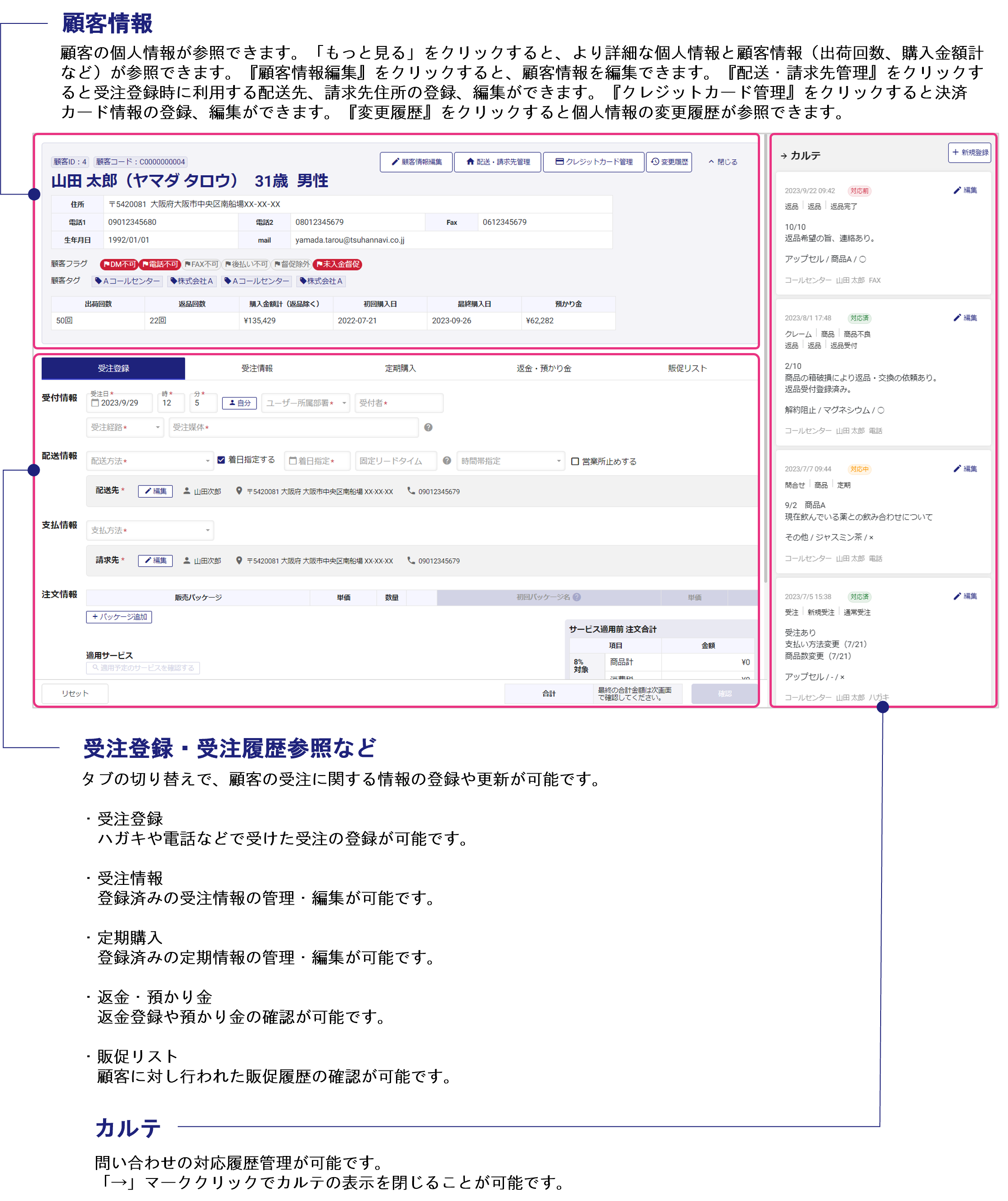 顧客サマリでは、顧客の個人情報の他、カルテや受注など、顧客に関するあらゆる情報の登録が可能です。