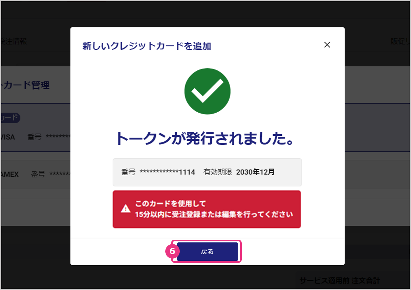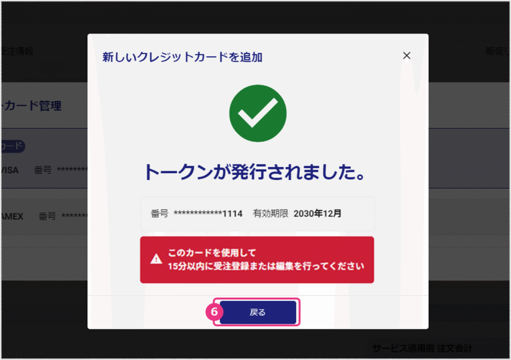 クレジットカード情報の登録後、15分以内に仮売上があがる操作(受注登録または受注編集)を行ってください。