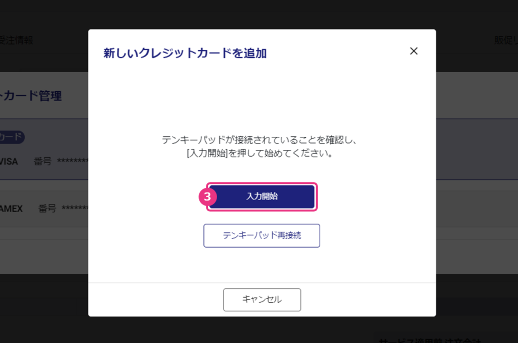 通販ナビ画面に「クレジットカード情報の入力待ちです。テンキーパッドから入力してください。」と表示され、テンキーパッドに「カード番号入力」と表示されたら、テンキーパッドでカード番号を入力し、 【Enter】キーを押します。
