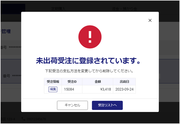 ※上記の内容で登録した場合、定期受注ですでに出荷手続きに進んでいる商品にのみ新しい住所が反映され、次回以降の定期配送先は旧住所となります。