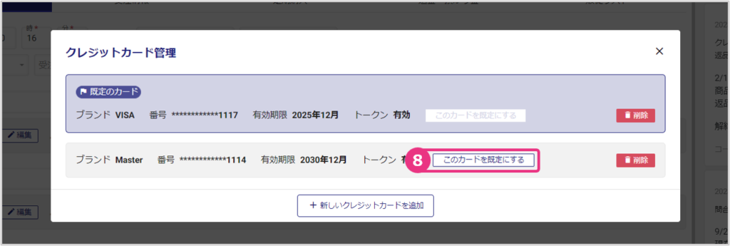 受注登録時の(支払方法:クレジットカードの場合の)デフォルトカードの設定が可能です。