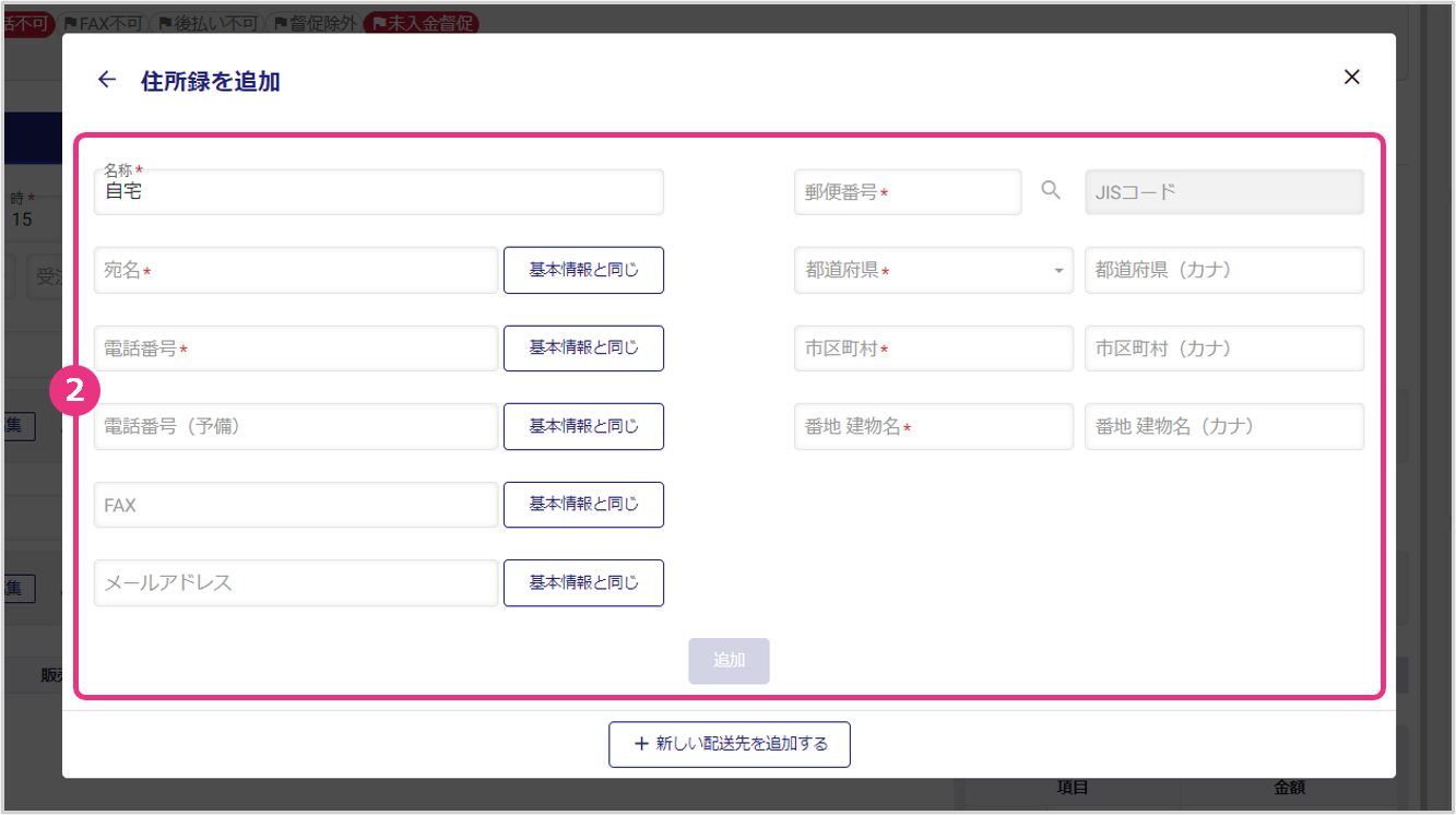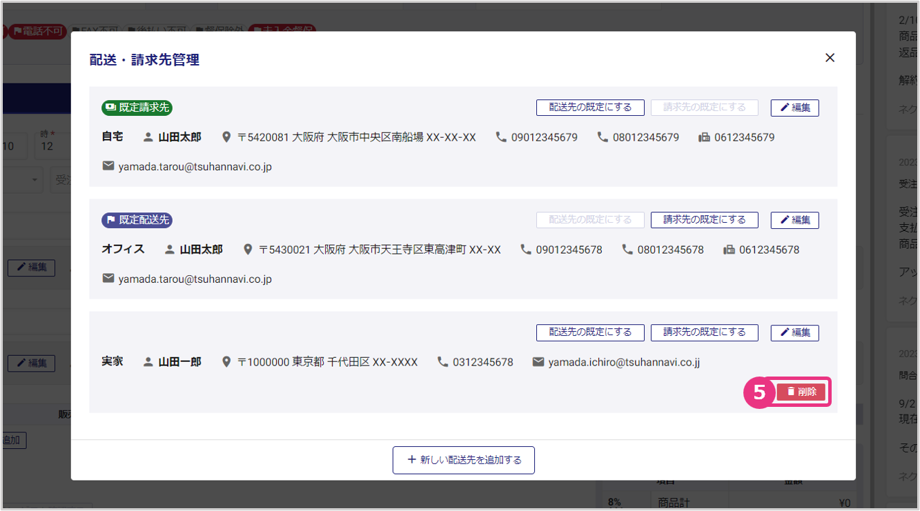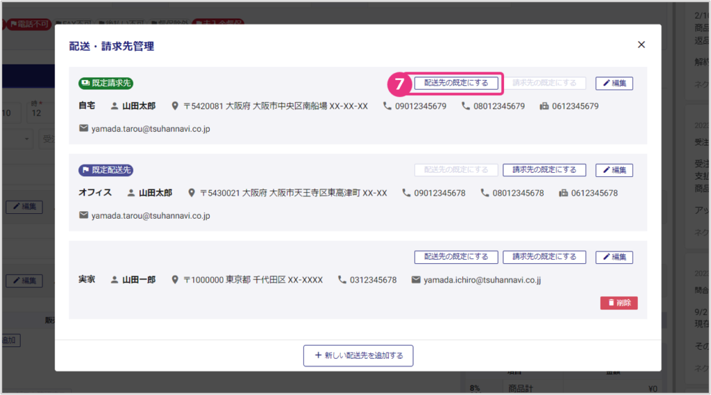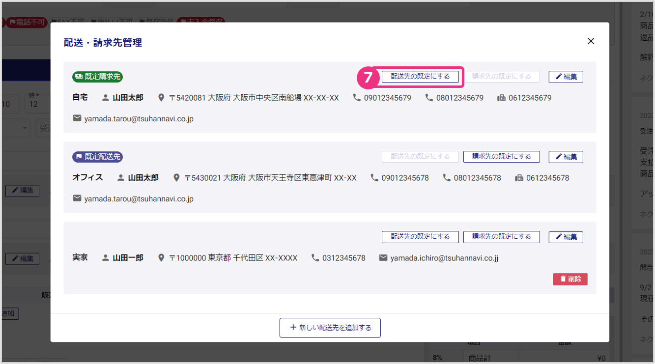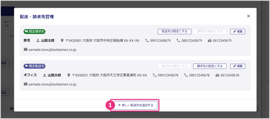 受注登録時に利用する配送先・請求先住所の登録、編集が可能です。