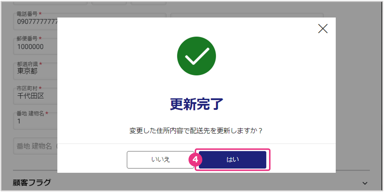 「変更した住所内容で配送先を更新しますか?」と表示されますので、変更後の住所を次回以降の受注登録時の配送先に設定する場合は『はい』をクリックします。
