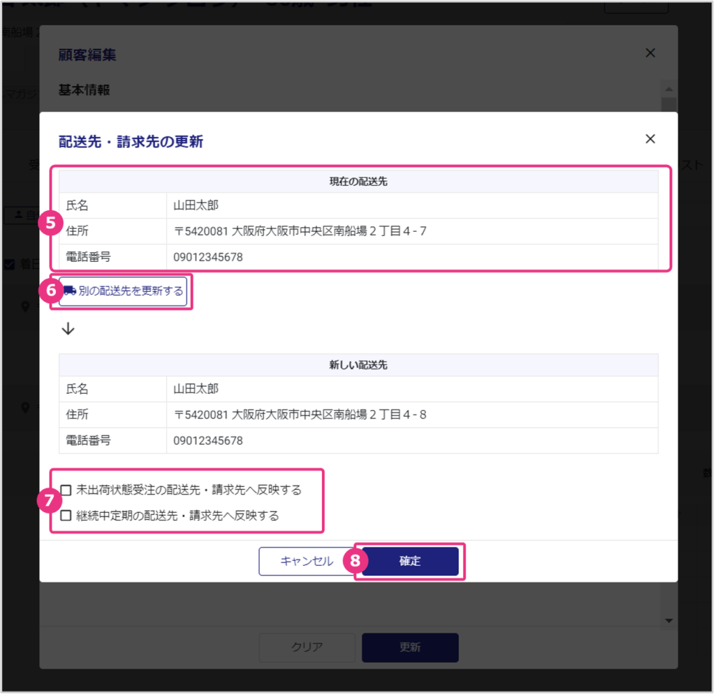 未出荷状態の受注に対し、新しい住所を配送先・請求先に変更したい場合はチェックを入れてください。