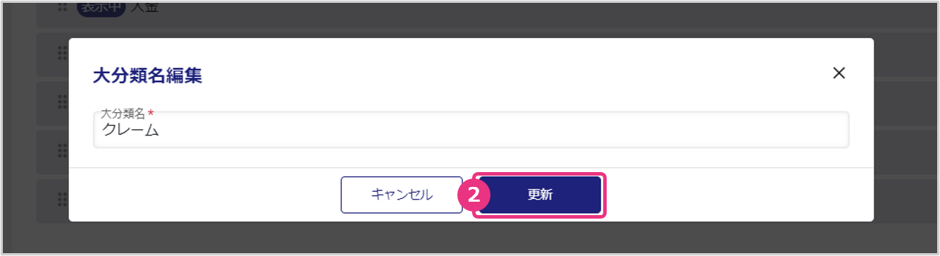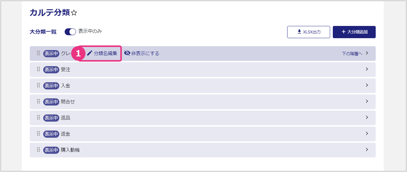 | ① | 「表示中のみ」のチェックを外すと、非表示設定中の顧客タグを含む全ての顧客タグが表示されます。 |