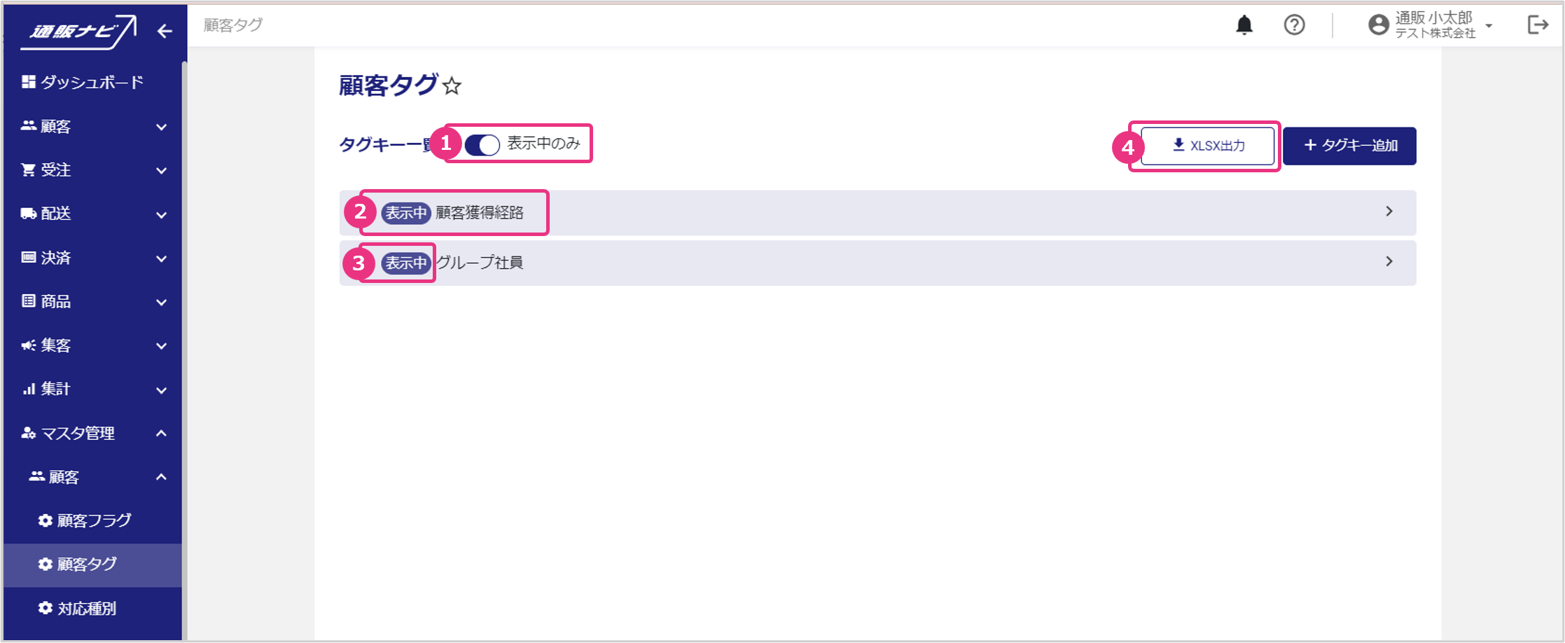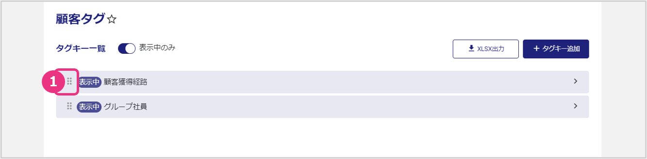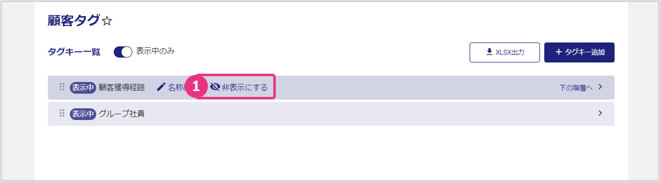 | ④ | 「XLSX出力」をクリックすると登録された顧客タグ(非表示を含む)が一覧で出力できます。 |