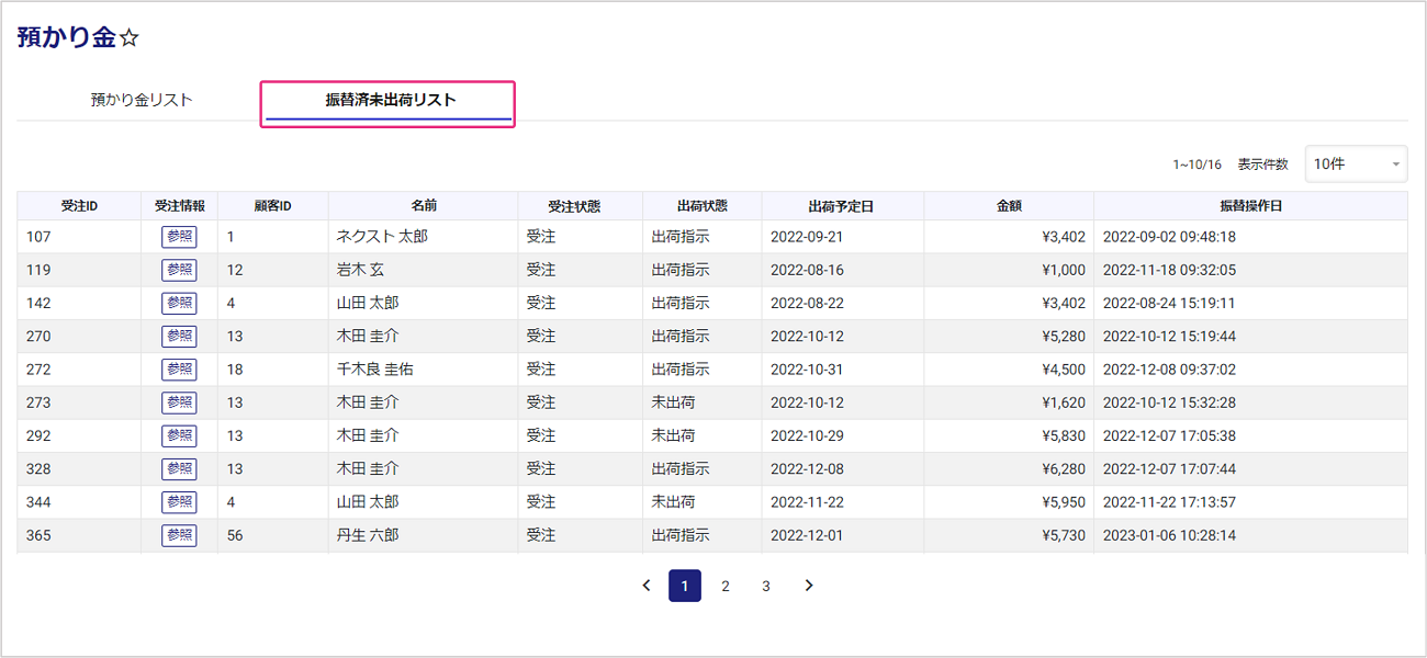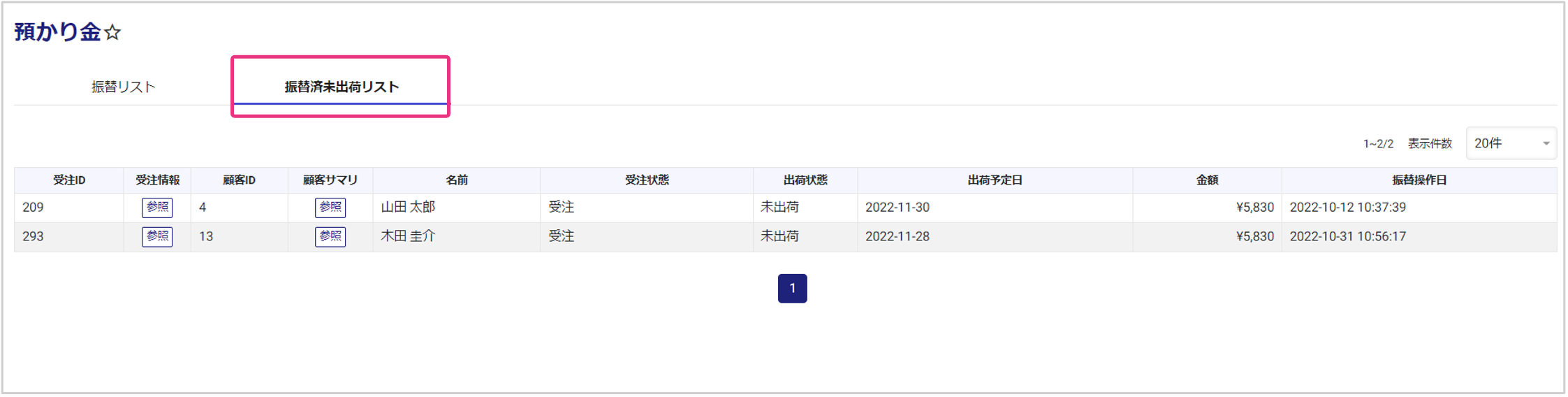預かり金からの振替入金により預かり金が消失すると、「預かり金リスト」からは表示が消え、振替先となった受注情報が「振替済未出荷リスト」に表示されます。