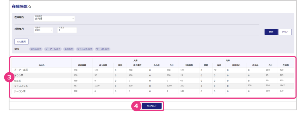『XLSX出力』をクリックすると、日次在庫管理表が出力されます。