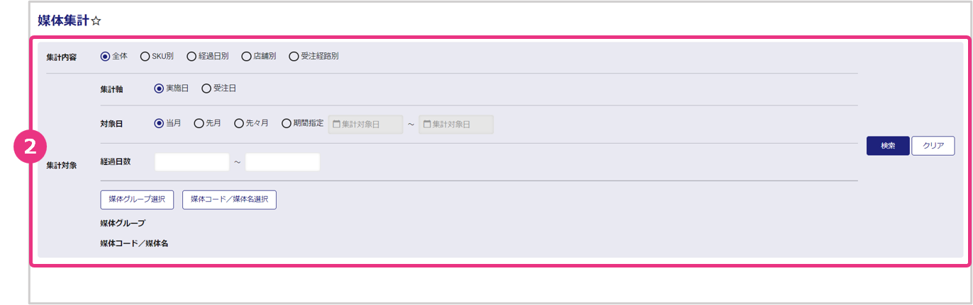 | 媒体コード/媒体名 | 媒体コード/媒体名で集計を絞る場合、『媒体コード/媒体名』をクリックし、該当の媒体コード/媒体名を選択します。 |