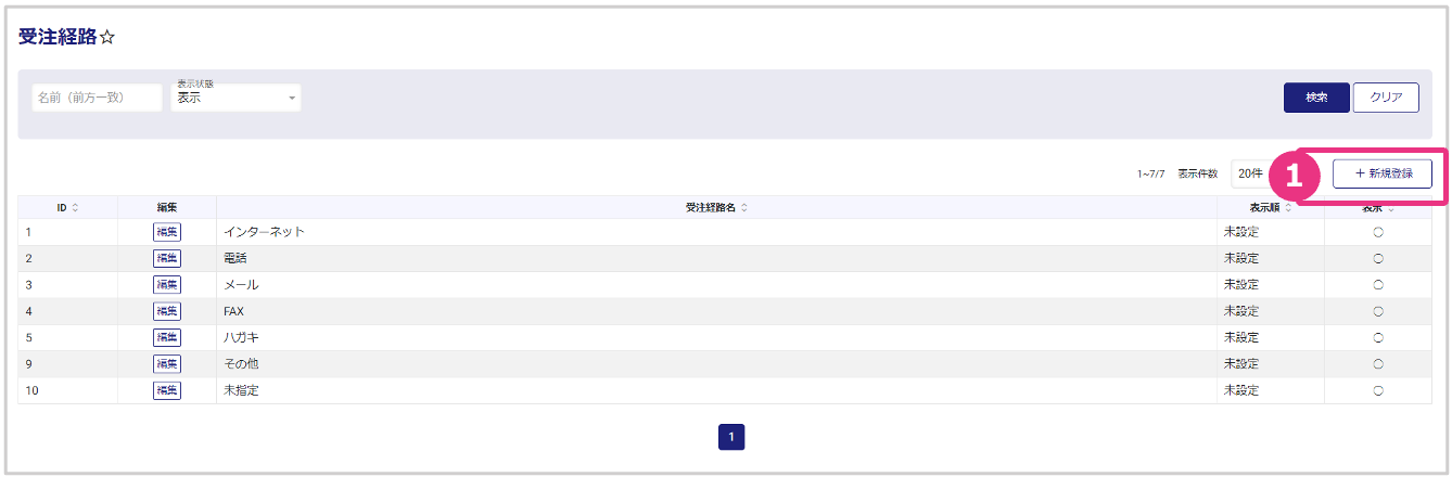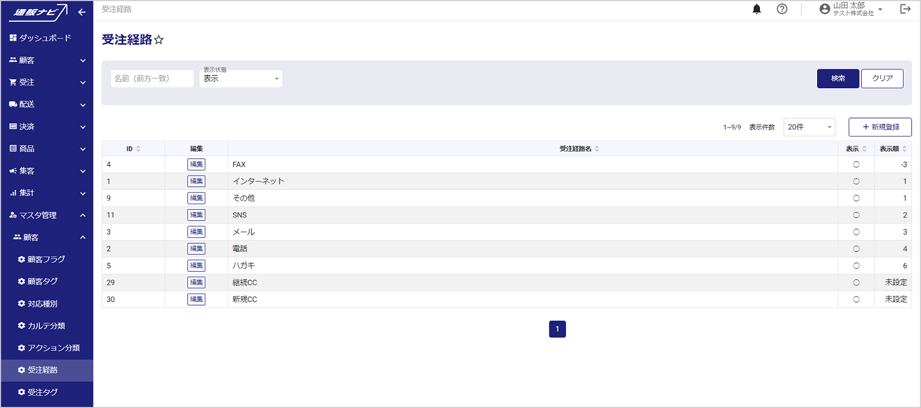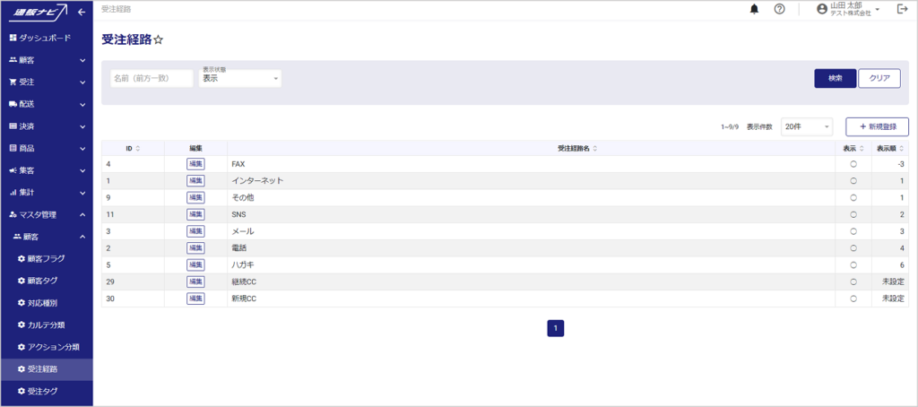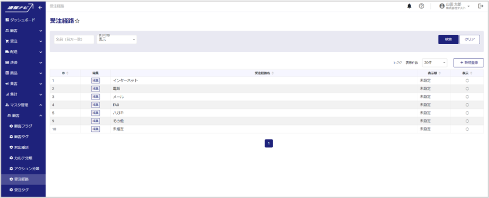 左メニューから、マスタ管理>顧客>受注経路を開くと、受注経路一覧が表示されます。
