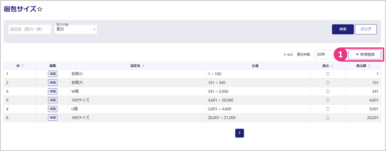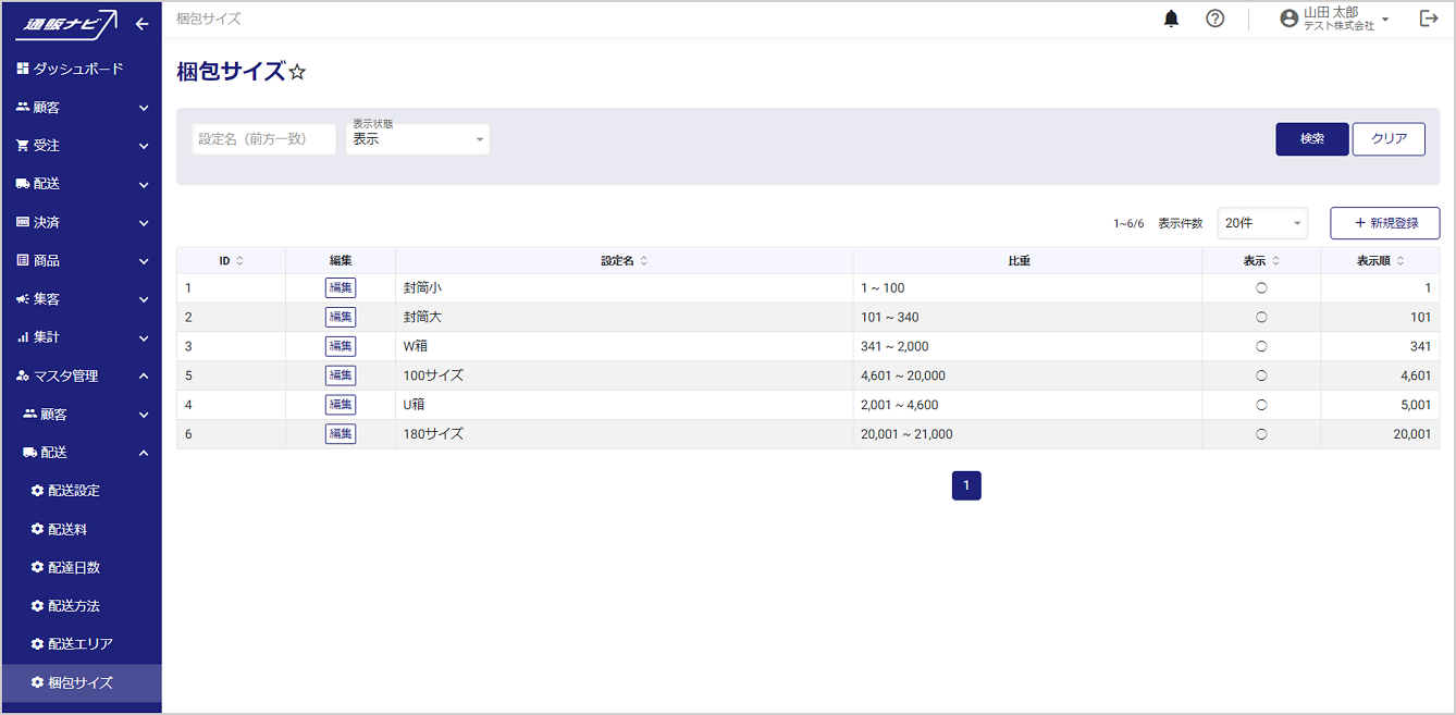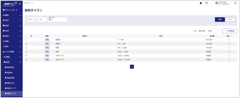 左メニューから、マスタ管理>配送>梱包サイズを開くと、梱包サイズ一覧が表示されます。