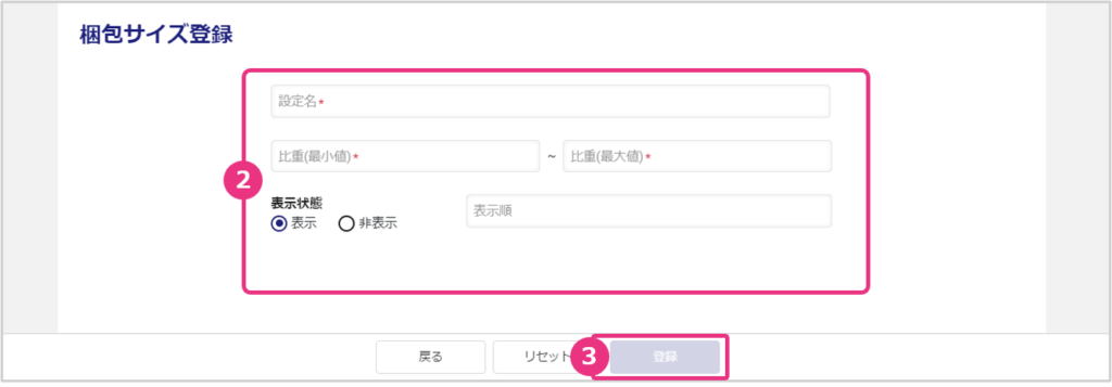 | 比重(最小値) * | 梱包材が許容できる体積(比重)の最小値を入力します。※他の梱包サイズの比重と重ならないように設定してください。 |