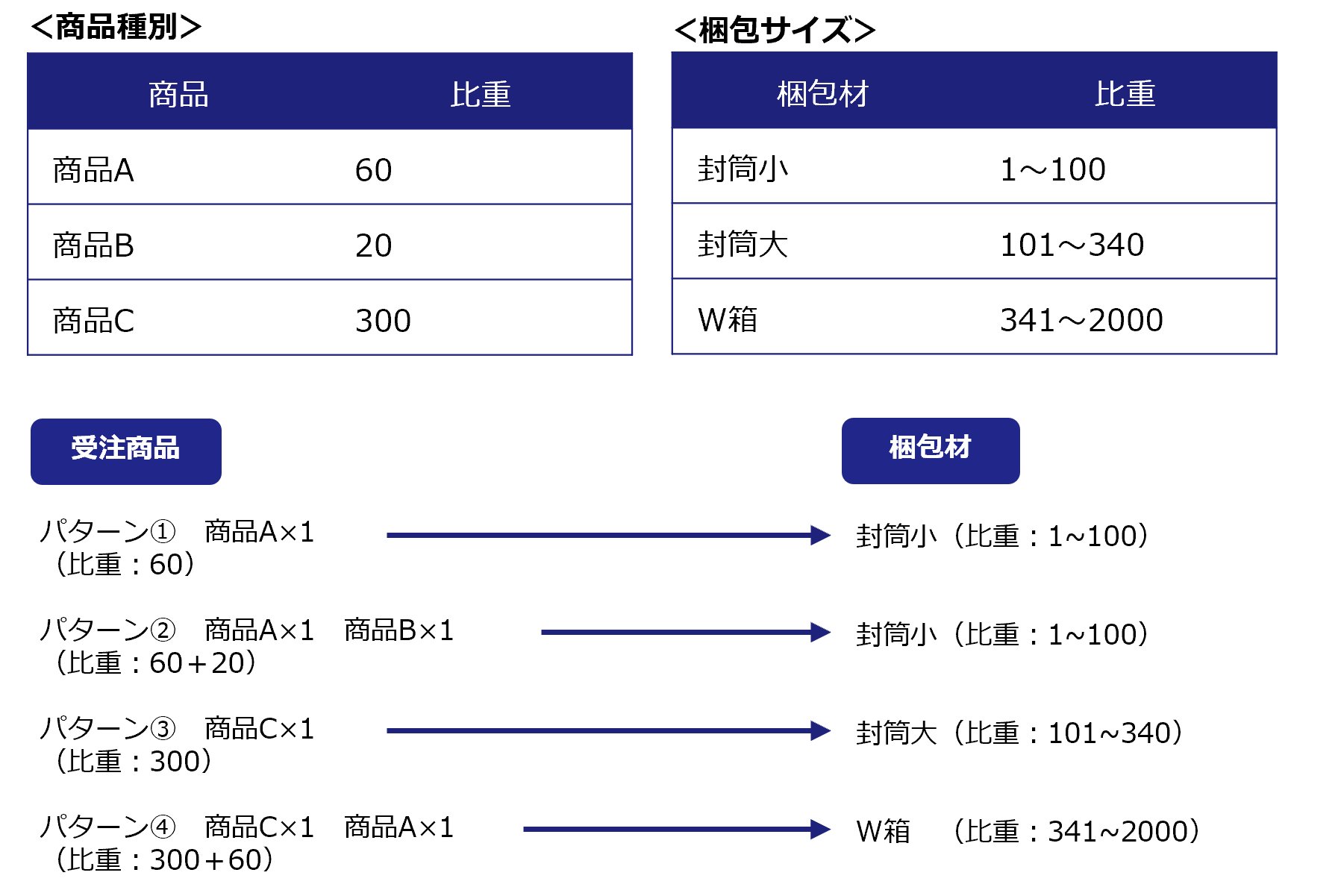 梱包材ごとに、許容できる体積(比重)の範囲を登録することが可能です。「商品種別」の比重とあわせて登録しておくことで、出荷作業時に生成されるピッキングリストに、受注商品に応じた適切な梱包材が表示されます。