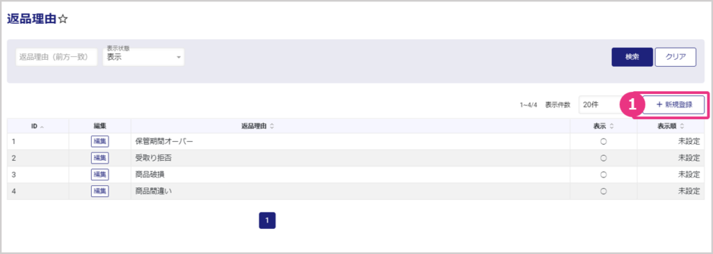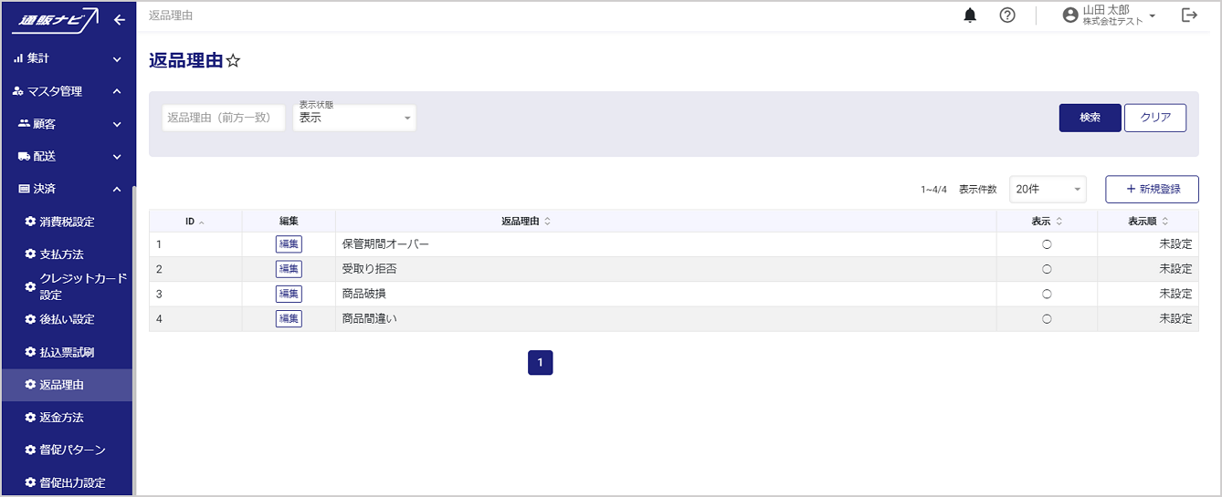 左メニューから、マスタ管理>決済>返品理由を開くと、返品理由一覧が表示されます。