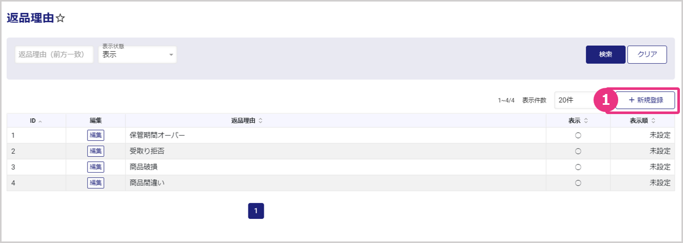 返品理由マスタを登録します。登録した返品理由は返品登録時に紐づけることができます。