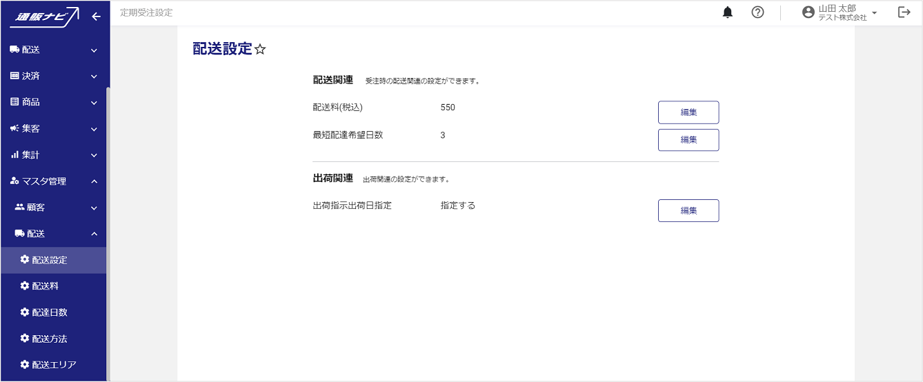 配送料や最短配達希望日数など、配送に関するマスタの設定を行います。