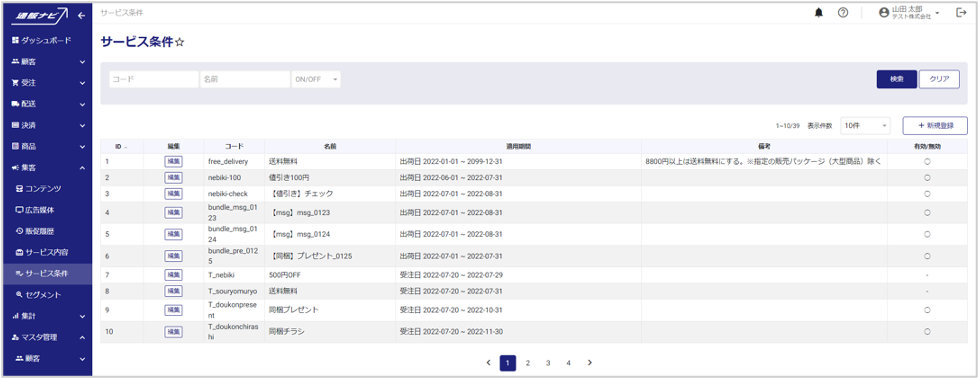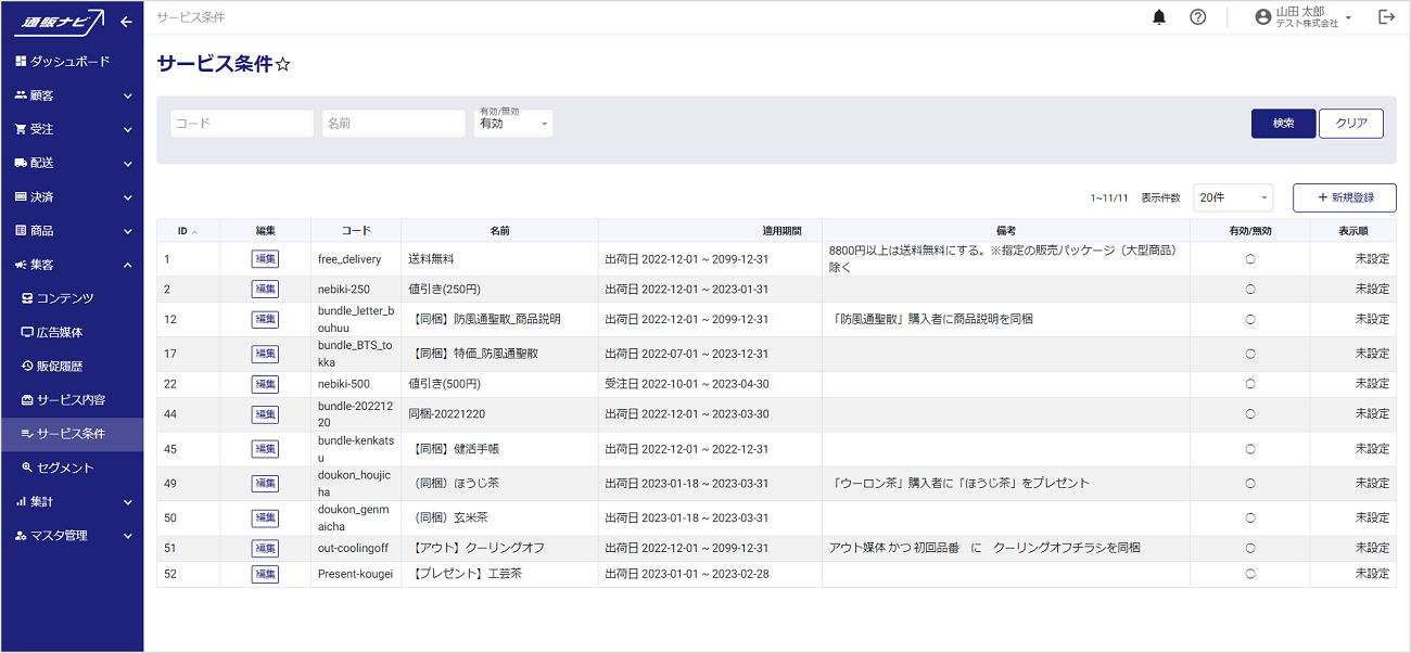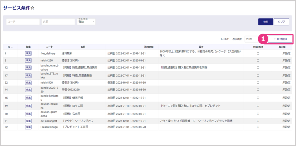 左メニューから、集客>サービス条件を開くと、サービス条件検索画面が表示されます。