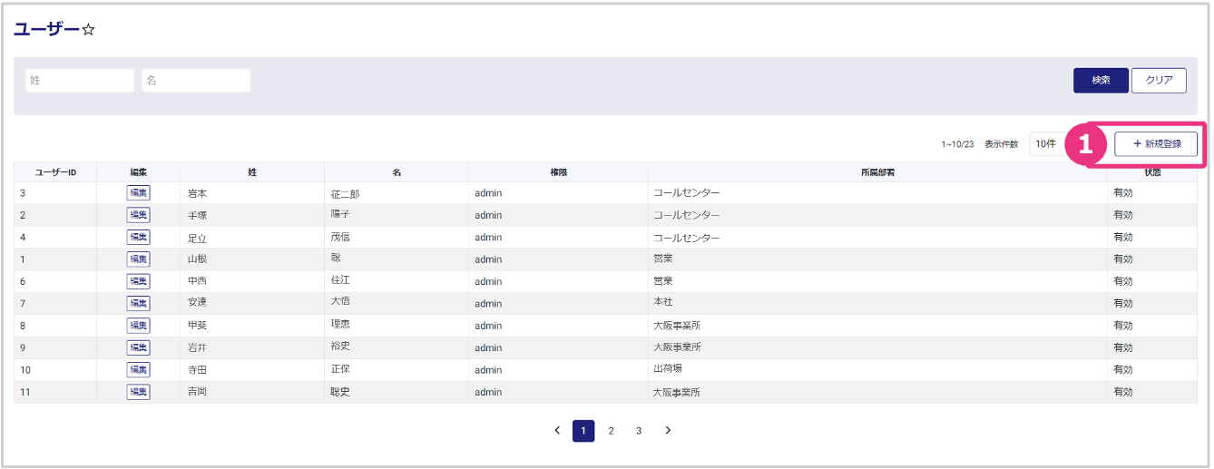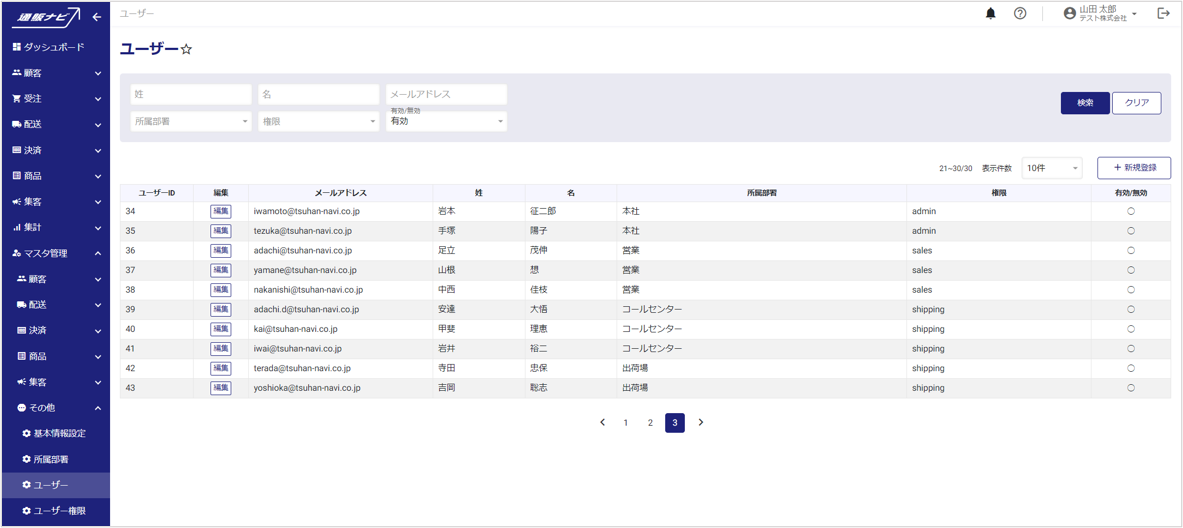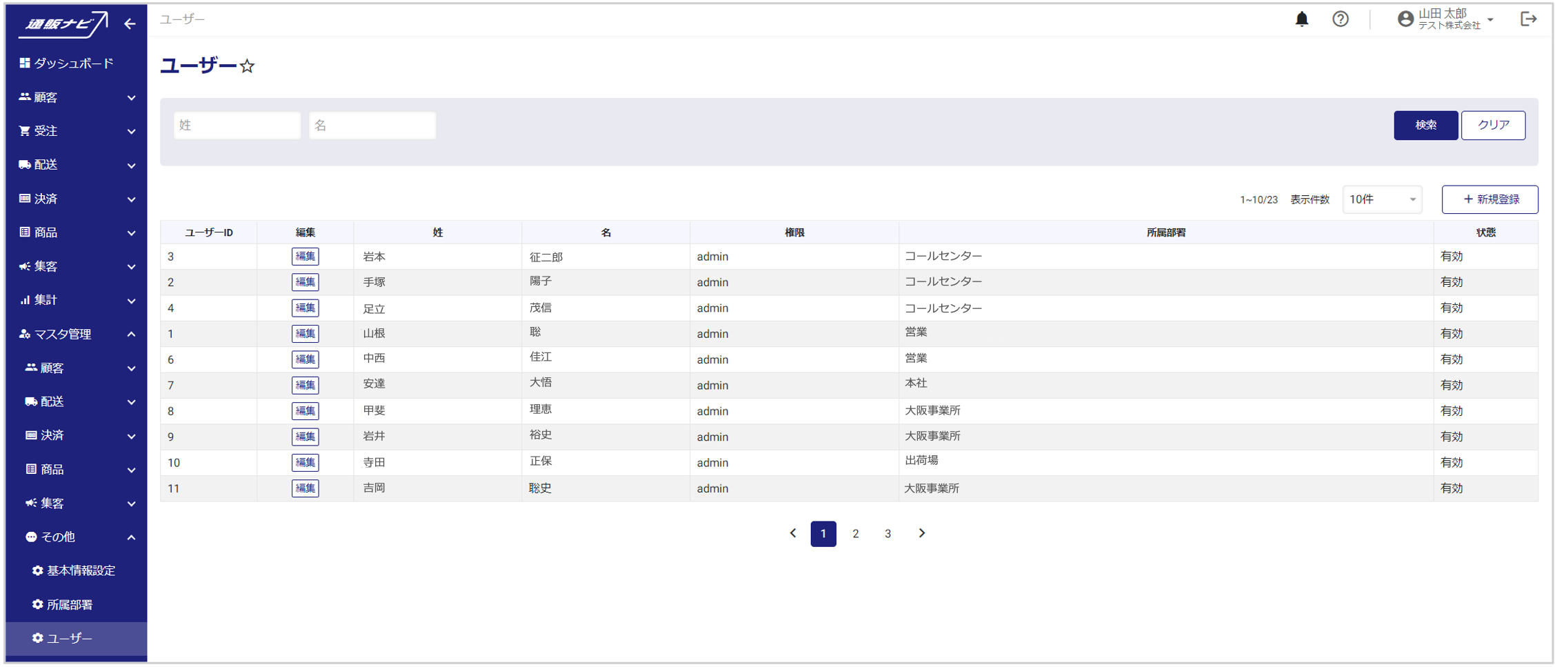 左メニューから、マスタ管理>その他>ユーザーを開くと、ユーザー一覧が表示されます。