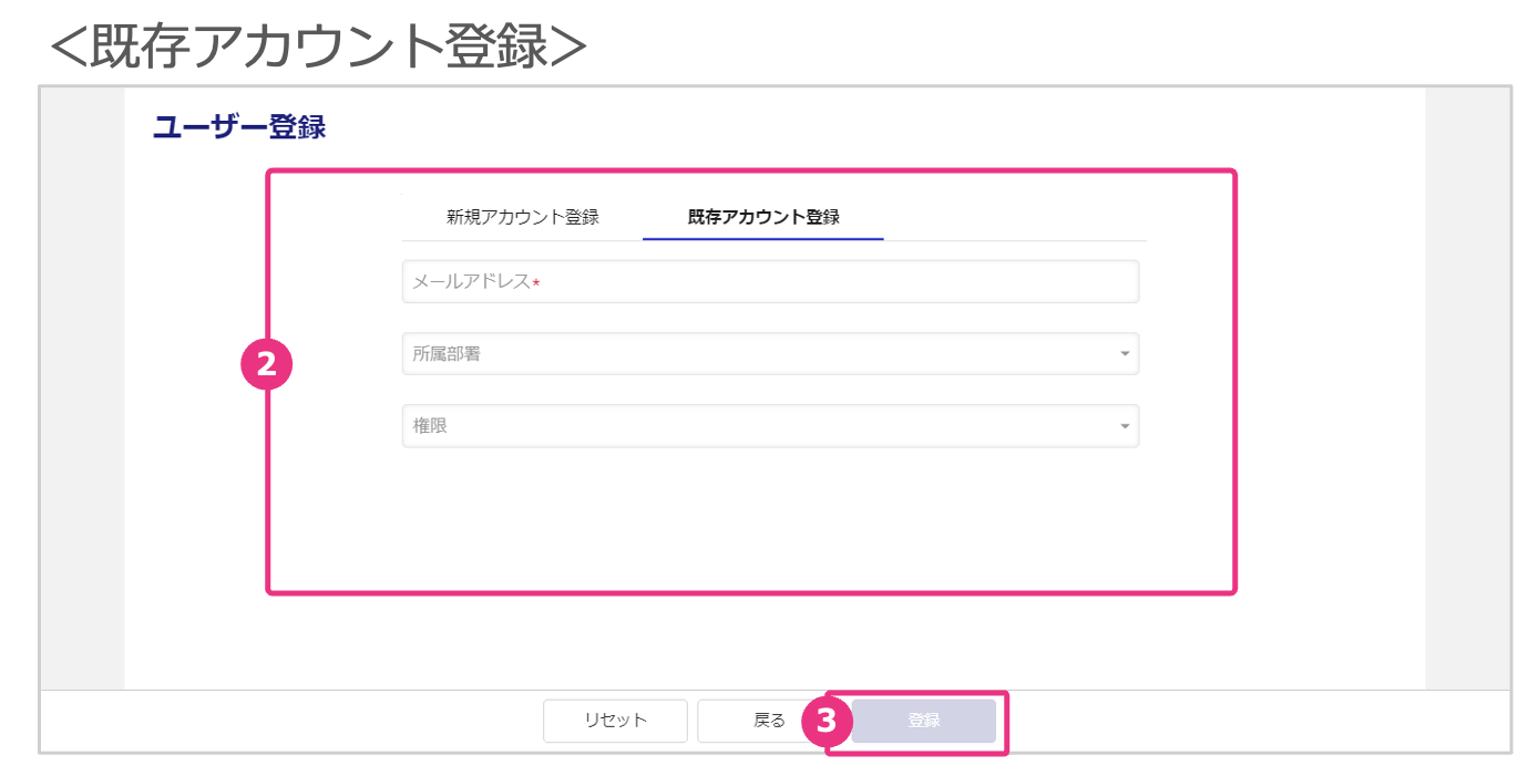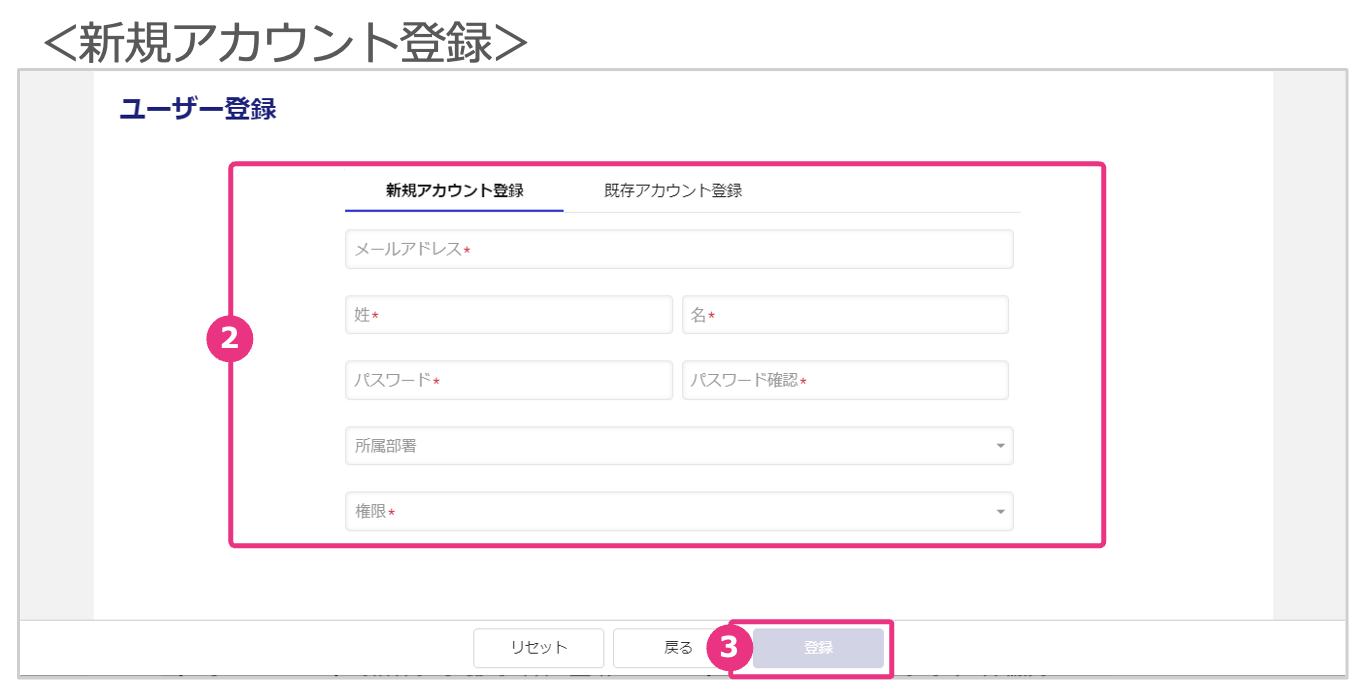 ユーザー情報を入力します。新規アカウント登録の場合は「新規アカウント登録」タブから、既に他企業でアカウント登録済みの場合は「既存アカウント登録」から登録を行います。